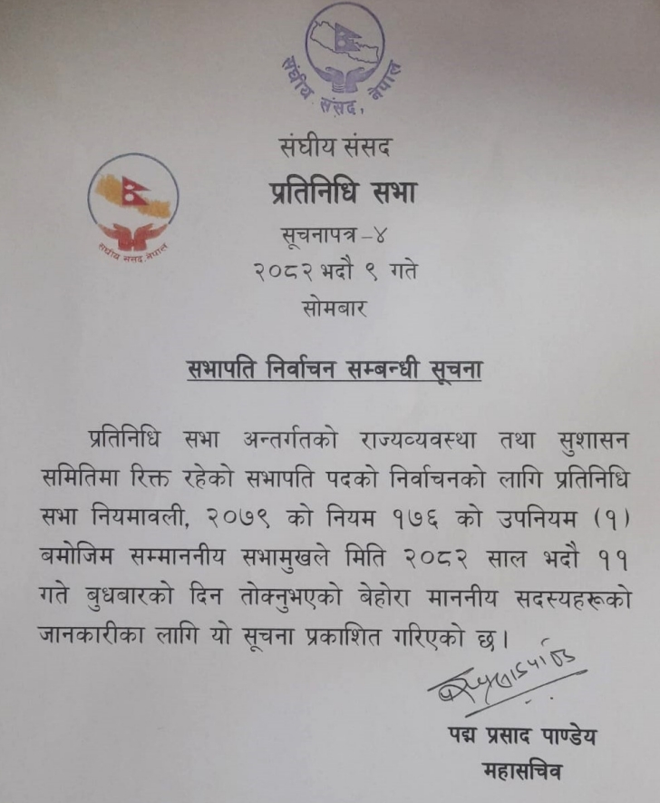 राज्य व्यवस्था तथा सुशासन समितिको सभापतिको निर्वाचन यही बुधबार हुने